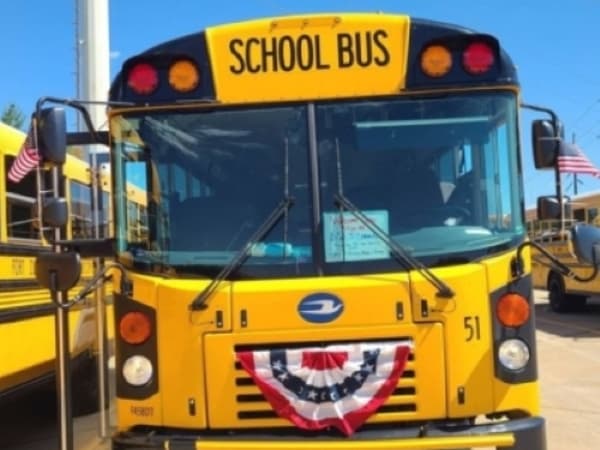 Markie Bibb's Bus No. 51 bears red, white, and blue bunting in honor of Lance Cpl. Jared Schmitz.
