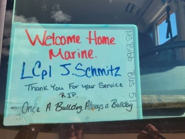"Once a Bulldog, Always a Bulldog" proclaims the sign saluting Lance Cpl. Schmitz, a 2019 graduate of Fort Zumwalt South High School.