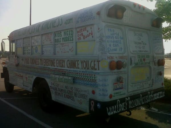 Bob Votruba has a goal: convince as many as people as he can to perform 1 million acts of kindness in their life. To spread his message, Votruba bought a 1990 small bus on Craigslist to tour the country. Family and friends helped him paint the bus with positive messages. Furnishings inside include a plywood bed. For more info, go to www.onemillionactsofkindness.com.