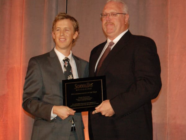 SBF Executive Editor Thomas McMahon (left) presented David Anderson, director of transportation and fleet at Adams 12 Five Star Schools in Thornton, Colo., with the magazine's 2012 Administrator of the Year award.
