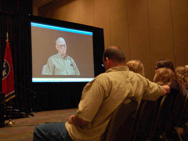 One presentation took a hard look at a tragic school bus accident. The family of Hunter Pitt, who was killed when his school bus ran over him, watches a safety video they worked on with Missouri organizations. On screen is the driver of the bus that ran over Hunter, Willie Leonberger.