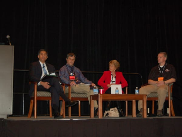 From left: Sunil Mansukhani of The Raben Group, Pete Meslin of Newport-Mesa (Calif.) Unified School District, attorney Peggy Burns of Education Compliance Group, and Bret Brooks of Gray Ram Tactical LLC discussed dealing with student conduct on the school bus.