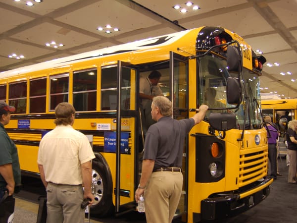 At the trade show, Blue Bird unveiled its 2014 All American Type D school buses, pictured here. Company officials said that features include superior fuel efficiency, turning radius, driver visibility and paint warranty.