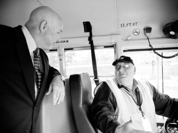 Duke talks with one of the company’s school bus drivers. Across all of its operations, National Express Corp. transports more than 1 million students daily.