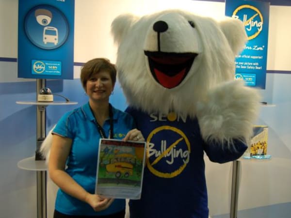 Seon’s Lori Jetha and mascot display one of the winners of the company’s anti-bullying coloring contest.