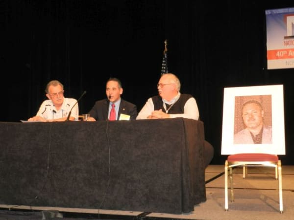 During a session to mark Veteran’s Day, NAPT members who have served in the military discussed how that experience influenced their pupil transportation careers. From left are Joe Seyfarth, Peter Lawrence and Steve Simmons. The portrait is of Brandon Billingsley, who had planned to participate in the panel but died unexpectedly in October.