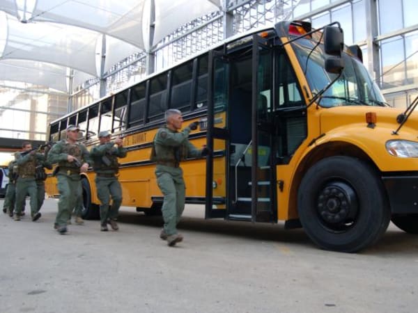 SWAT team members sweep a school bus after the live-action event that simulated a response to an active shooter.