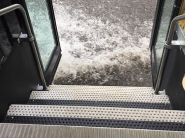 The view through the passenger doorway of a Hillsborough school bus shows flooding from the storm. As Operations Manager Pam Coleman put it, “The best revenge to the massive storm Irma was the joy it gave our department in transporting our community to safety.”