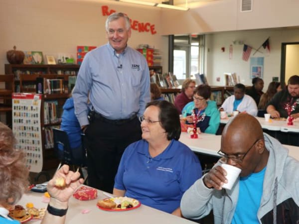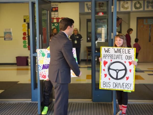 North Carolina State Superintendent Mark Johnson joined the celebration of student transporters with a visit to Salem Elementary School where he attended a breakfast held in their honor. Students gave Johnson and school bus drivers a warm wlecome.