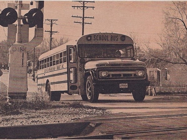 Here, a 1963 Carpenter school bus on a Chevrolet chassis, operated by Deerfield-Highland Park (Ill.) Transit (now Olson Transportation), prepares to cross railroad tracks. The photo was sent by Ray Olson, who now runs the company with his brothers.