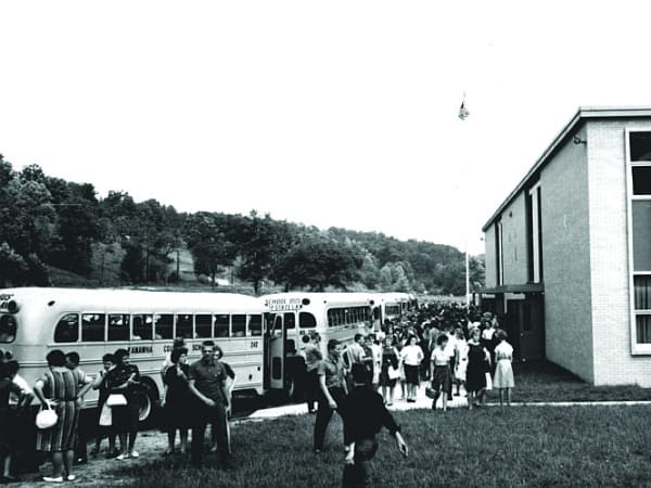 Students arrive for the opening of Herbert Hoover High School in Clendenin, West Virginia, in September 1963. The photo was sent by Brette Fraley, executive director of transportation at Kanawha County (W.Va.) Schools.