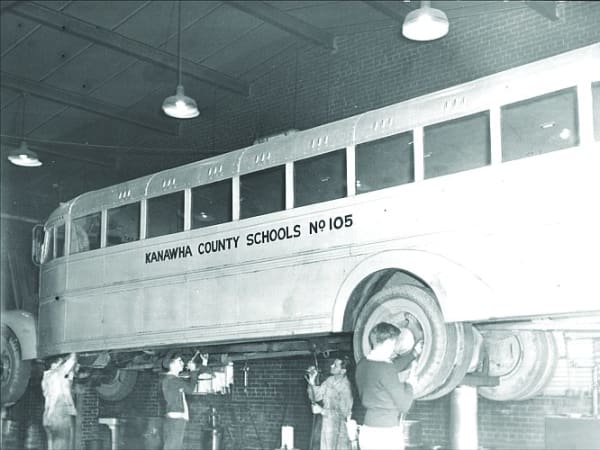 High school shop students work on a Kanawha County (W.Va.) Schools bus in this photo, submitted by Fraley.