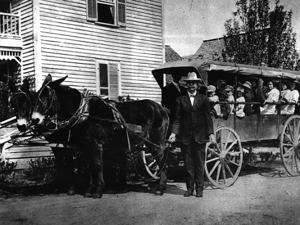 Some buses have horsepower; this one had mule-power! North Carolina pupils packed into the wagon for the ride to school. State pupil transportation director Derek Graham submitted the circa-1910 shot.