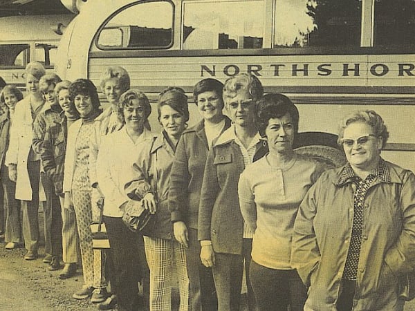 Drivers from Northshore School District in Bothell, Washington, pose for a photo next to Crown school buses in 1974. Transportation Manager Connie Noll notes that the taller woman who is 11th from the right, Carol Crook, is still driving for the district.