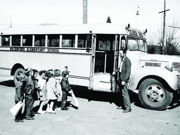 School bus driver Harvell McElroy talks with kindergartners in Waterford, California, in the 1954-55 school year. The photo was submitted by Suzanne Bauer, director of transportation for Waterford Unified School District.