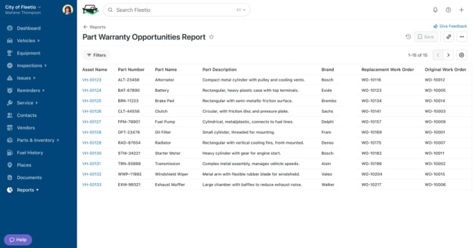 Fleetio's new Part Warranties feature allows maintenance teams to automatically track and manage parts under warranty, helping to prevent overstocks and increased inventory costs. When a warrantable part is replaced during a work order, Fleetio flags it, alerting technicians to potential warranty claims needing to be sent to the manufacturer for review. Additionally, Fleetio will prompt technicians to confirm part replacements and indicate if a part should be retained, helping to coordinate the warranty claim process with their vendors. Fleetio also provides a Part Warranty Opportunities Report that lists all warrantable parts, detailing original installation and replacement work orders and parts numbers. This report can be customized, saved, and scheduled for regular review to prioritize timely claim submissions. By leveraging this feature, school bus maintenance teams can maximize warranty recoveries, reduce operational costs, and maintain a high standard of safety for students.