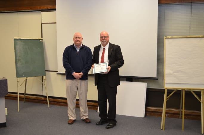 Michael Shields (right), director of transportation and auxiliary services for Oregon’s Salem-Keizer Public Schools, says vetting information with executive-level individuals prior to presenting at a board meeting will help in understanding the board’s position on specific topics. Shields is pictured with school board Chairperson Jim Green accepting the 2013 Dennis Essary Leadership award.