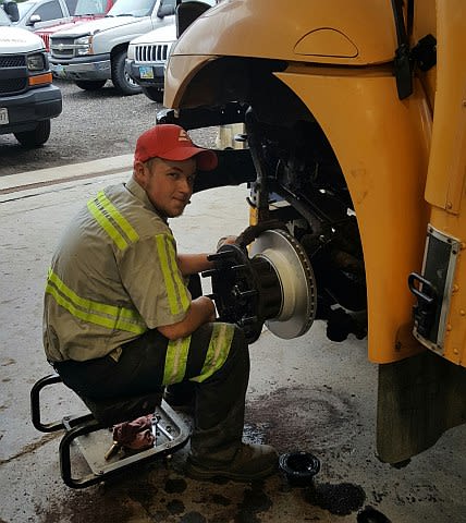 Prioritizing routine maintenance can prevent inspection violations. Austin Hamlin, a mechanic for school bus contractor VAT, performs routine brake service.