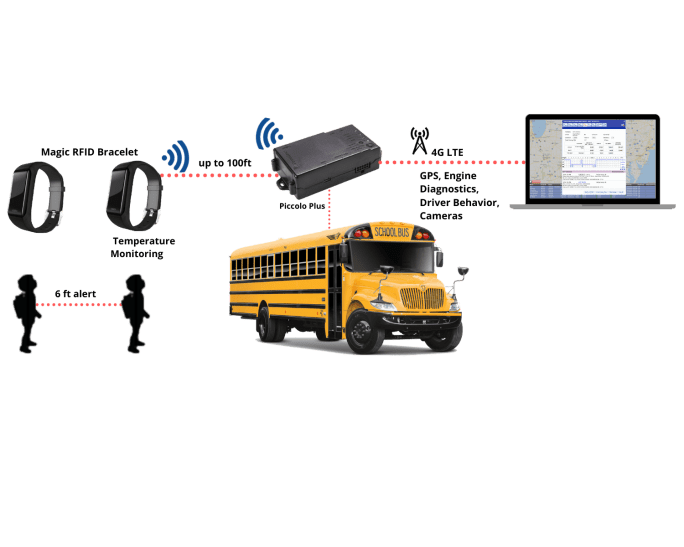 The system monitors every student while aboard the bus, tracks attendance and when and where each student boards and exits the bus. The system can also account when, where, and at what time each student entered their school, and track students’ locations and temperatures throughout the school grounds.