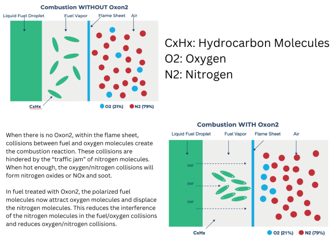 Fuel Matrix offers a fuel modifier called Oxon2. The fuel, emissions, and soot reduction technology works in any internal combustion engine (ICE) vehicle. It works on a molecular level by adding a very slight charge to fuel, which creates a heightened attraction between oxygen and fuel molecules. That creates a more efficient burn. This attraction also “crowds out” the nitrogen molecules during combustion, so less nitrogen burns during combustion and less soot and NOx is produced, according to PR Director Tracy Barrett.