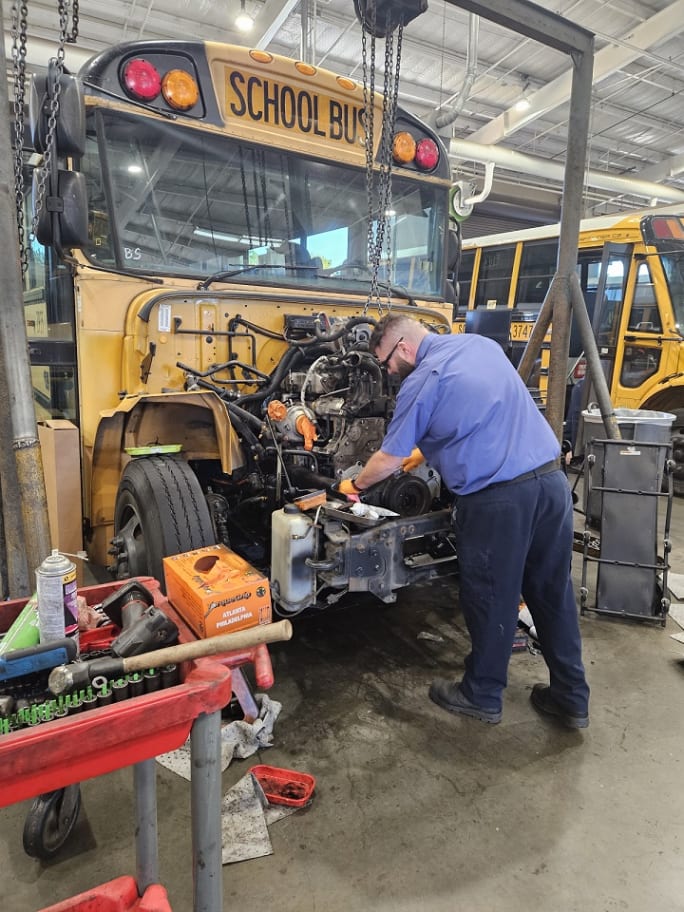 A school bus technician works on one of the school buses in the Gwinnett County (Ga.) Schools fleet, which once again came in first for our fleets in the 2023 School Bus Fleet survey.