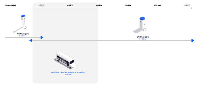 Based on our experience operating dozens of school bus charging sites across North America, and delivering hundreds of charging simulations, we have found that the “sweet spot” for school bus chargers is 19.2 kW AC up to 60-80 kW DC.