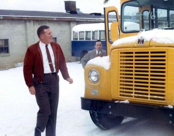 Clifford takes possession of a new 1964 Superior school bus on an International Harvester chassis.