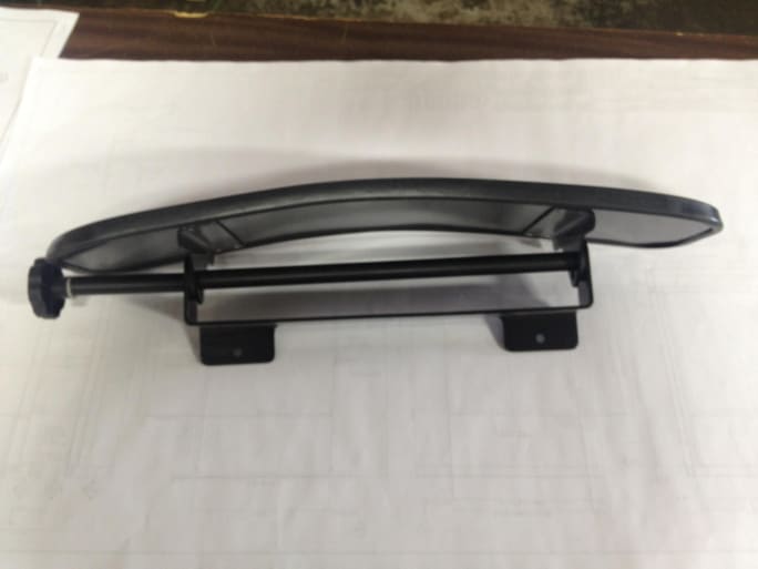 The mirror has the same driver-controlled knob tensioner as its predecessor, but it features a smaller, 6-inch by 24-inch convex, safety-tempered glass lens.
