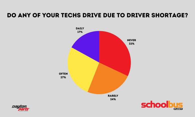 In line with other recent data, the driver shortage is lessening, at least in terms of maintenance techs having to step in and cover routes. This year, 32% of fleets said their techs said they never had to get behind the wheel, up from 25% last year.