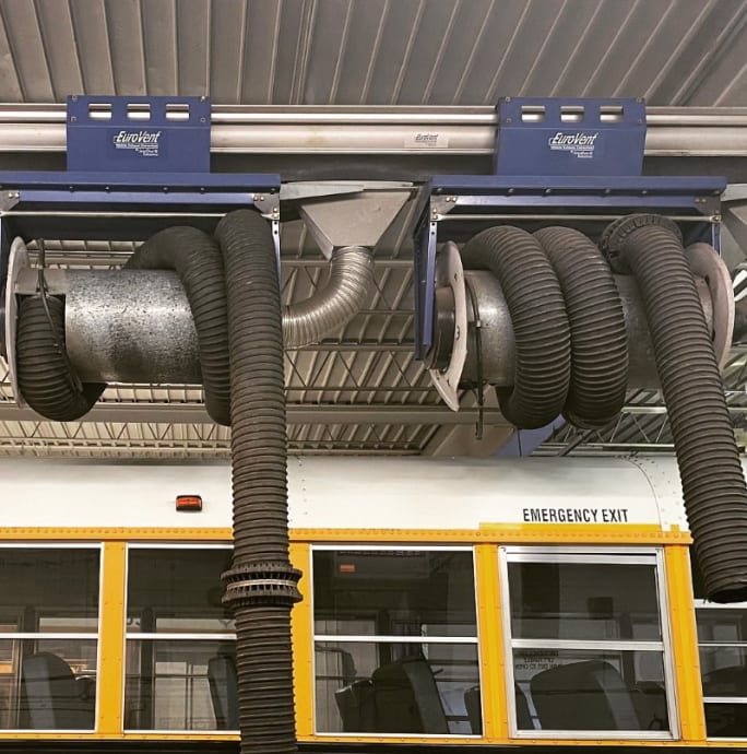 JohnDow's EuroVent Vehicle Exhaust Extraction System eliminates harmful vehicle exhaust fumes from interior bus repair facilities.