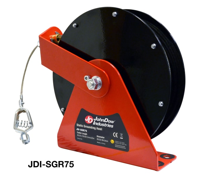 The Static Grounding Wheel from JohnDow is a 75-ft. cable length reel that includes slow retraction, a ratchet-locking mechanism, and auto-release that activates wire over-stretching