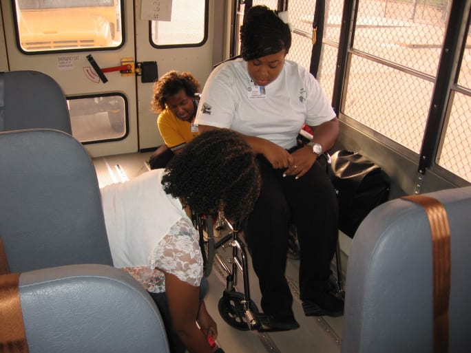 At Houston’s Cypress-Fairbanks Independent School District, full-time substitutes — classified as charter drivers — have to be employed by the district for one year and have acceptable attendance to be considered for the job. Here, charter drivers undergo training on wheelchair securement.