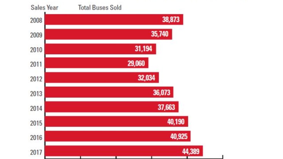 North American school bus sales grow for the sixth year in a row. The 2017 total of 44,389 units is the highest mark in more than 10 years.