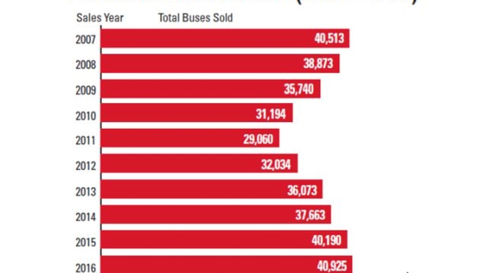 The 2016 total of school bus sales in the U.S. and Canada, 40,925 units, is the highest mark for the industry in the past 10 years.