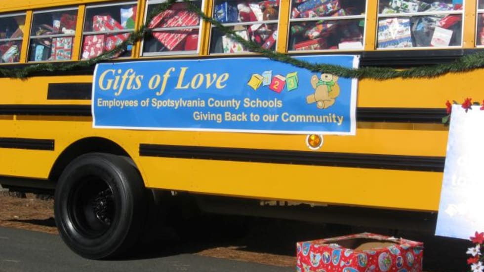 A school bus plays the part of Santa’s sleigh as “elves” from Spotsylvania County Public Schools deliver presents for children in need.