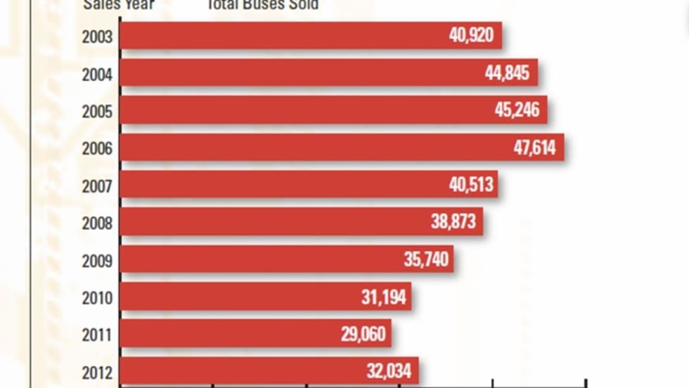 SBF finds that North American school bus sales rose from 29,060 units in 2011 to 32,034 units in 2012. The increase comes after five straight years of declining school bus sales.