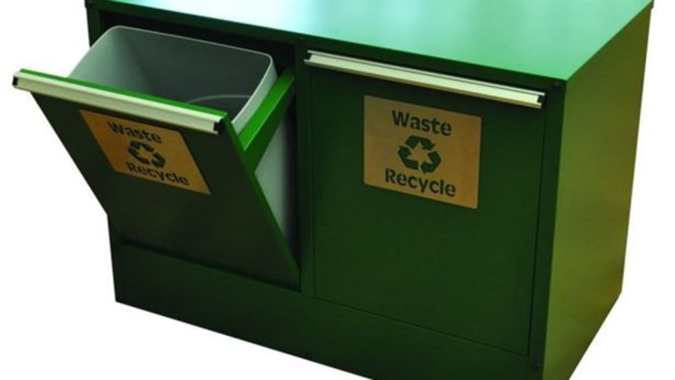 Shure's waste/recycle cabinet comes with a plastic receptacle for waste or recyclable materials. The cabinet comes in three models.