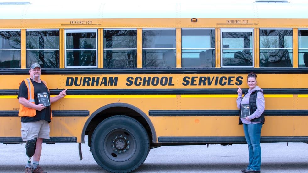 Durham School Services driver Rachel Suchan and bus assistant Dave "Big-Dave" Buckholz received the Love the Bus Award for their handling of a special-needs passenger whose guardian ran late for pickup.