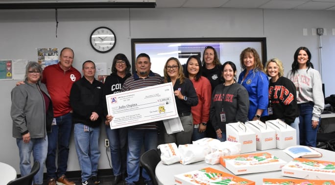 Julio Ospina (center) stands with other Wylie ISD team members, plus representatives from AMF-Bruns and the Texas Department of Public Safety. As part of the award, a celebration with check presentation was held at the district's facility.