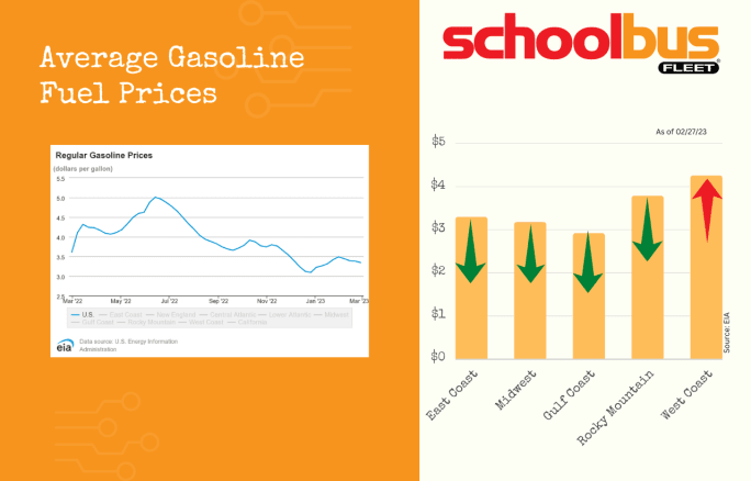 A gallon of diesel or gasoline cost school bus fleets less over the past week on average, ending the month on another decline, except in the West Coast region, where gasoline jumped about 6 cents.