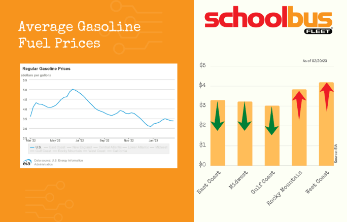 The average cost of diesel for school bus fleets continued falling in most parts of the country over the past week, while gasoline started leveling off - except in the Rocky Mountain and West Coast regions, where gasoline climbed between 6 and 8 cents.
