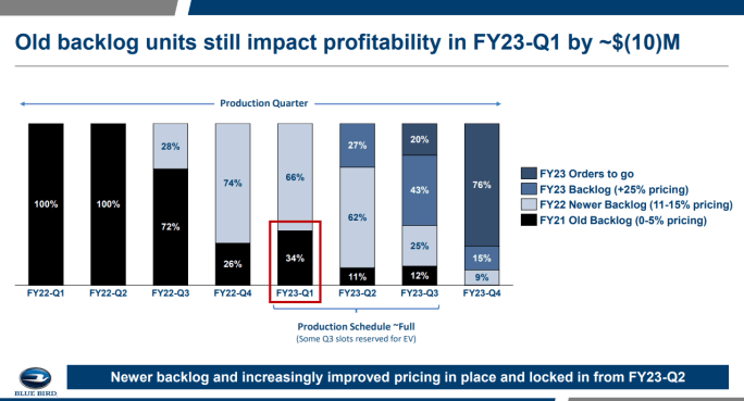 Blue Bird's nearly full production schedule for 2023 (with some Q3 slots reserved for electric vehicles) likely won't be clear of FY21 backlog orders until Q4.