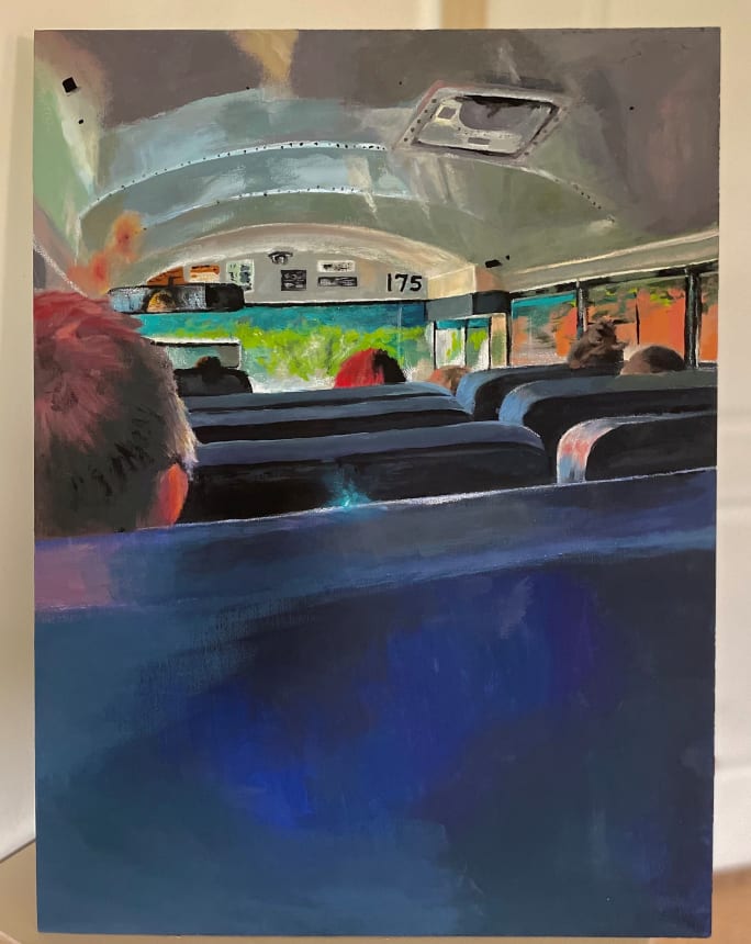 This painting, "A Peaceful Start to Seven Hours of Stress," shows the viewpoint of a student sitting toward the back of the bus and looking ahead to what the day might bring.