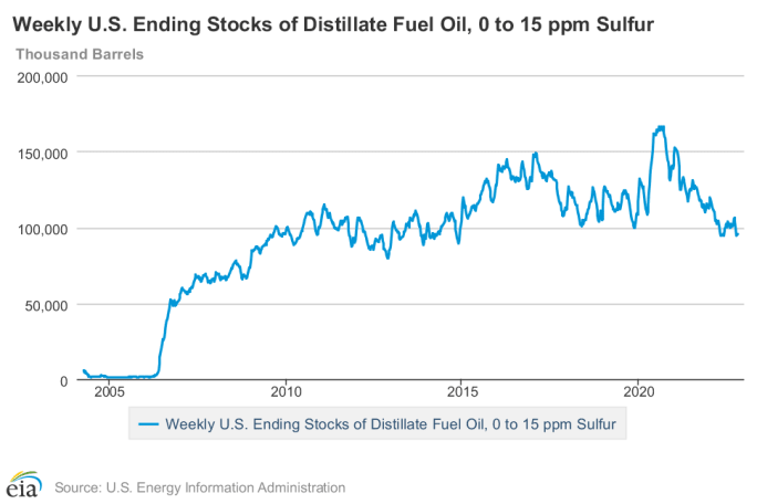 However, what those low stocks do mean is higher diesel fuel prices, especially in the Northeast where stocks are the lowest and diesel faces competition from fuel oil for home heating in the winter. On a normal day, the East Coast markets have 50 million barrels in storage, but right now, there are less than 25 million barrels available.