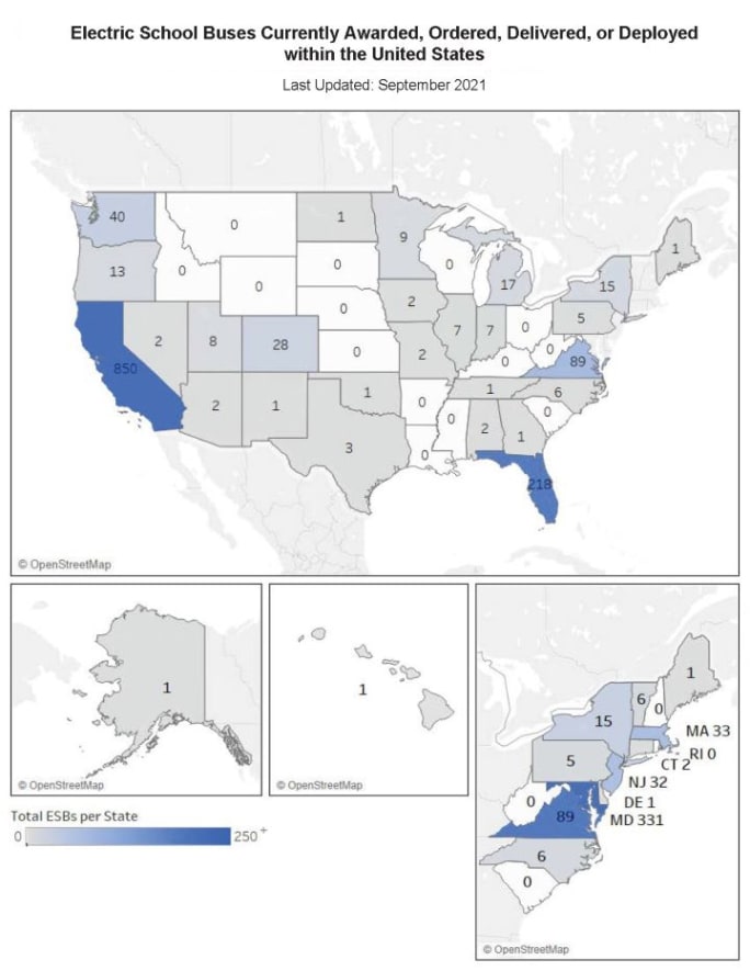 California, Maryland, and Florida lead the country in electric school bus deployment.