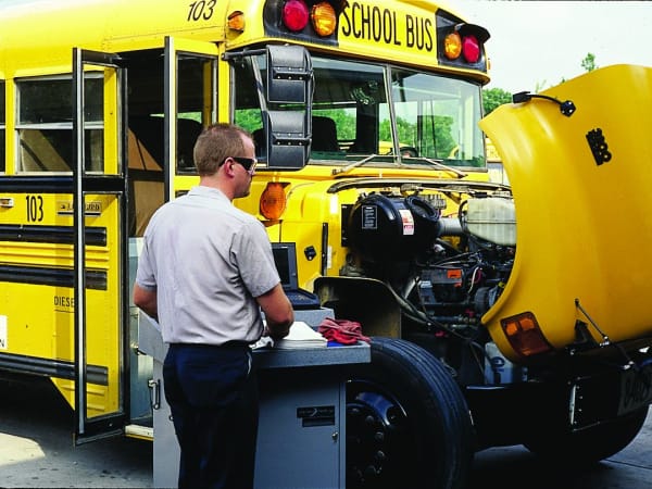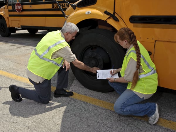 Two Durham school bus drivers conduct a pre-trip inspection.