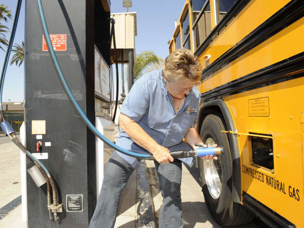 Here, a driver prepares to fill a bus with compressed natural gas. STI's company head is Denis J. Gallagher, chairman and CEO. The company's website is www.rideSTA.com.