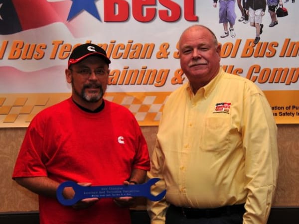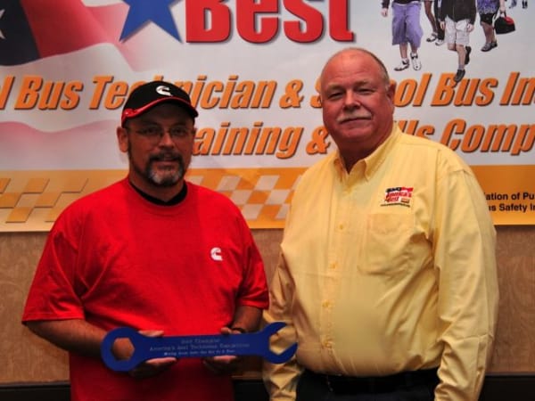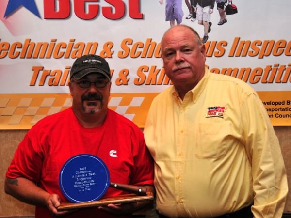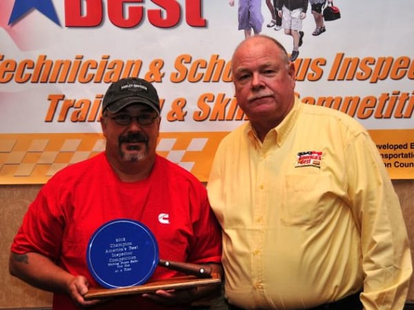 Jack Defibaugh (left) of Greenbrier County (W.Va.) Schools won the inspector competition. He is pictured with Bill Tousley, a National Association for Pupil Transportation board member and one of the organizers of the event.