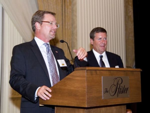 Dan (left) and Joe Kobussen accept the SBF Contractor of the Year award at the National School Transportation Association’s convention in Milwaukee on July 17.