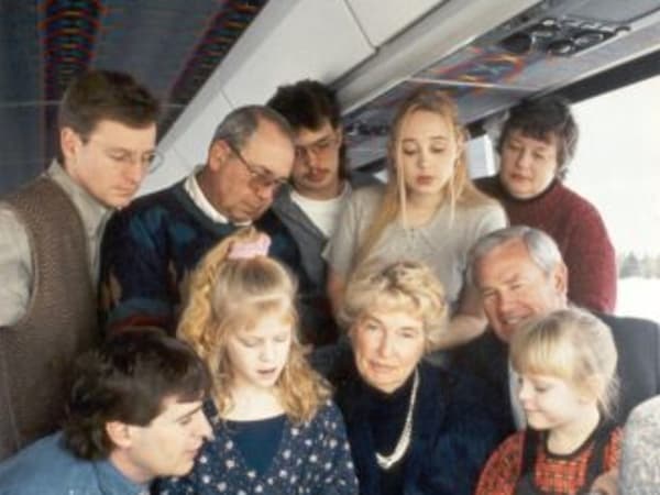 An older family portrait of the Kobussens on one of their motorcoaches (they run 31 motorcoaches in addition to their 452 school buses). Bottom row, from left: Joe, Amanda, Marion, Jim and Amy. Top row, from left: Dan, Mike, Scott, Melissa and Ann.